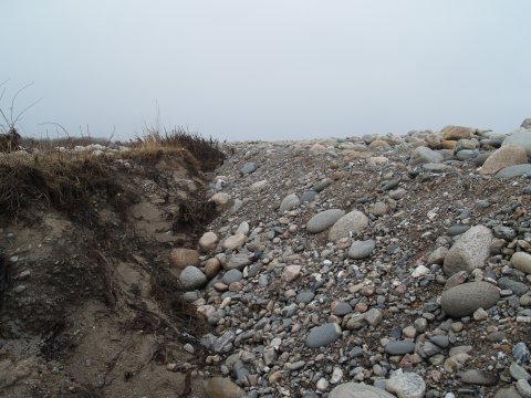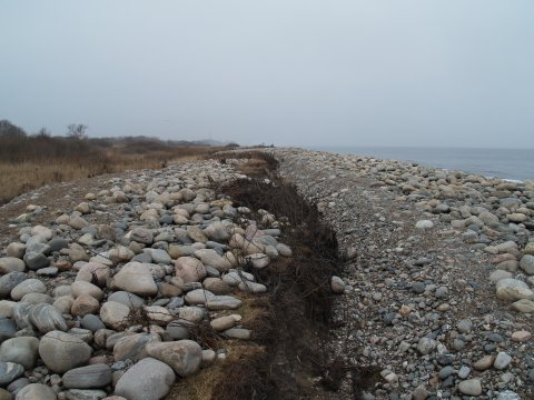 Først har havet gnavet af kysten, senere er der påfyldt en ny strandvold af store sten
